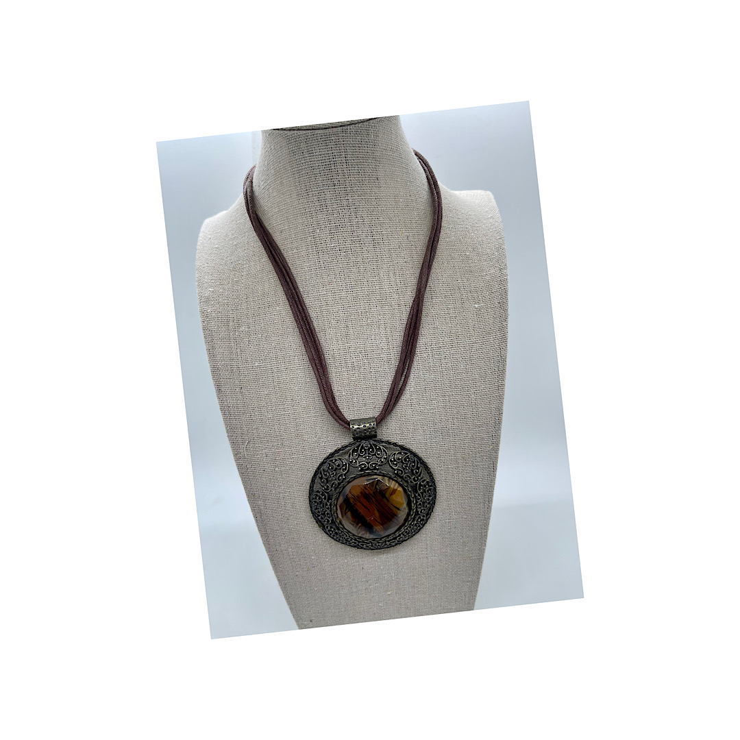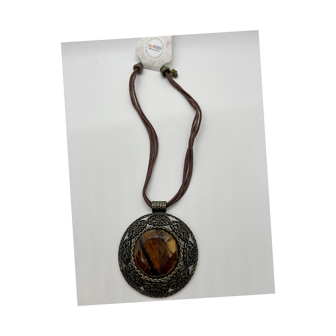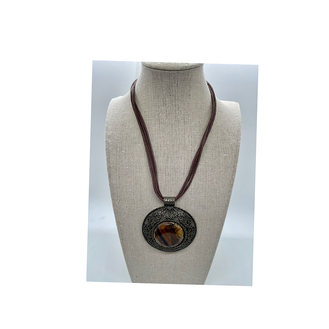 - Brown cording -Metal chain and closure - 22” -Center piece charm -Custom Design -Hand made -One of a kind -Made as in picture