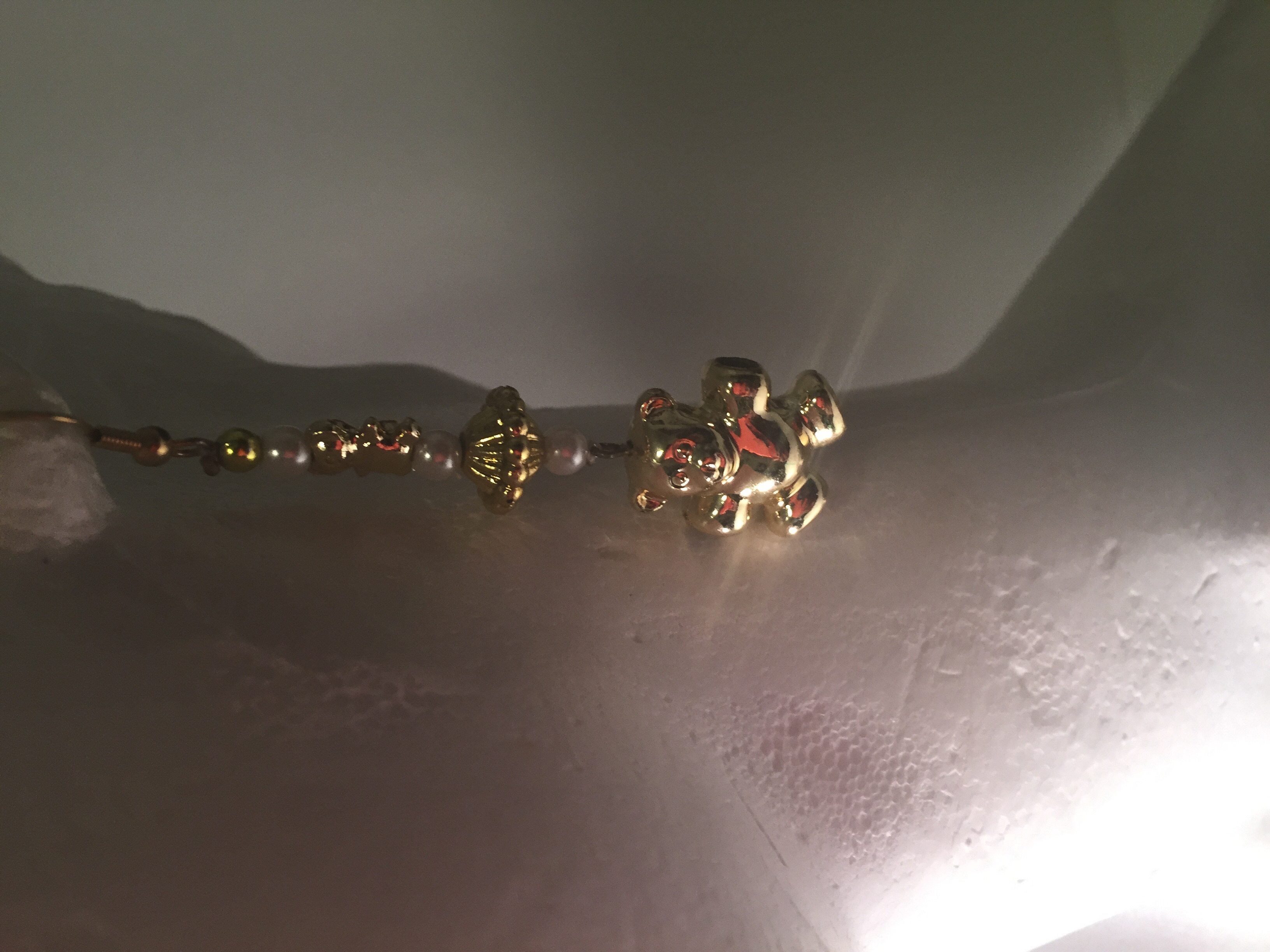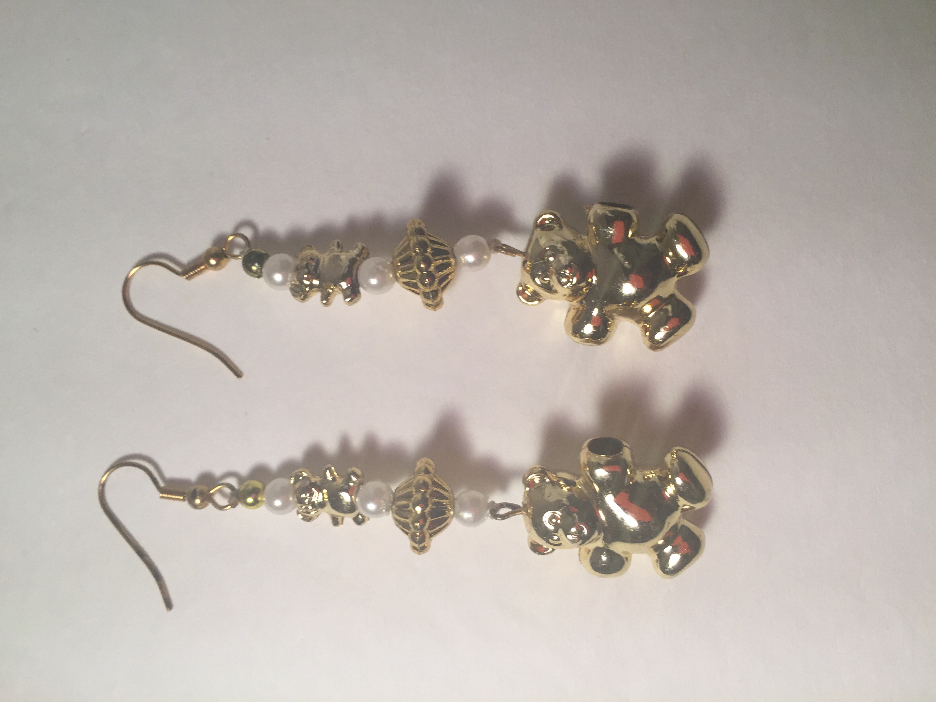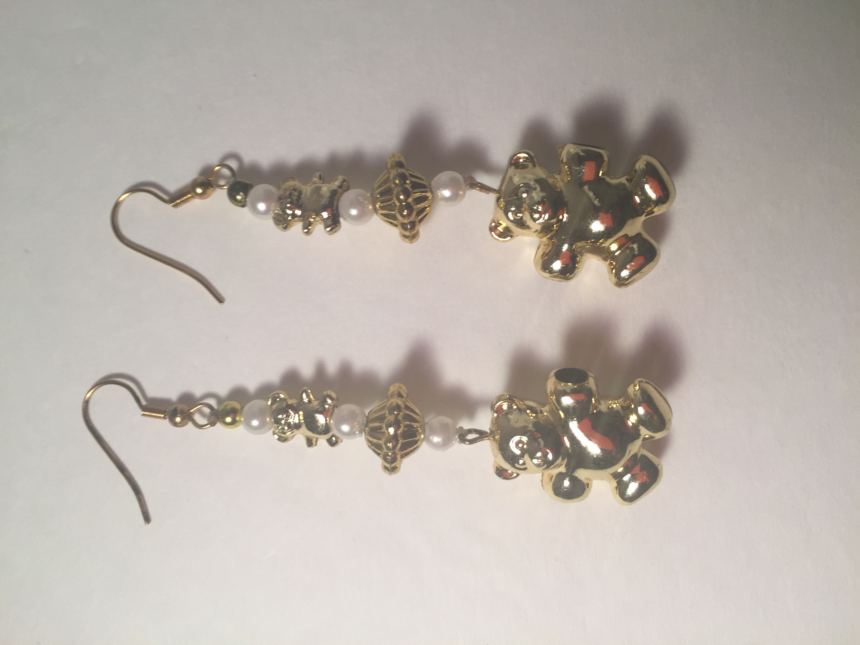 -White and Gold Beaded drop earrings -Gold teddy bear bead -Gold nickel free metal hook and wire -3" long -Custom Design -Hand made -One of a kind -Made as in picture