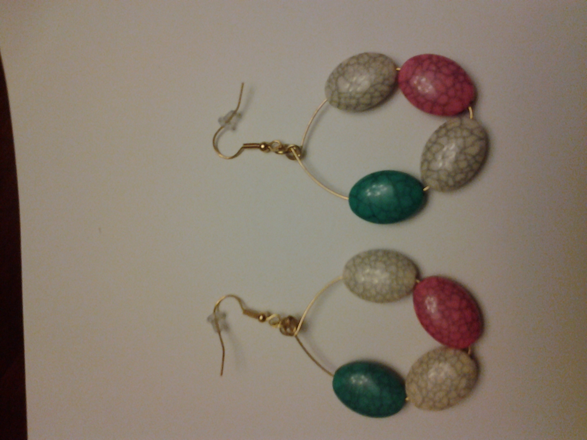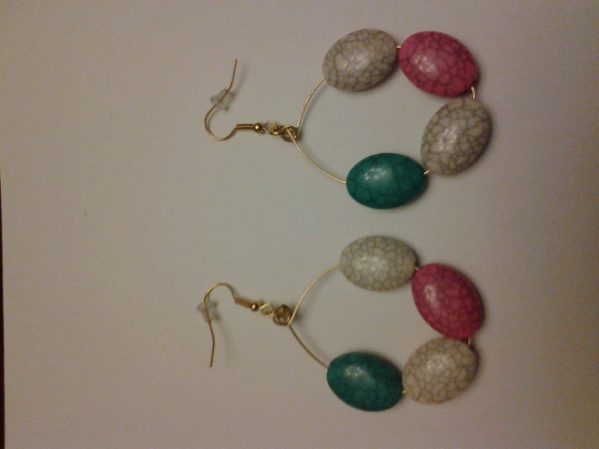 -Plastic beads -Gold wire and hook -White, pink, and turquoise -Handmade -Made as in picture