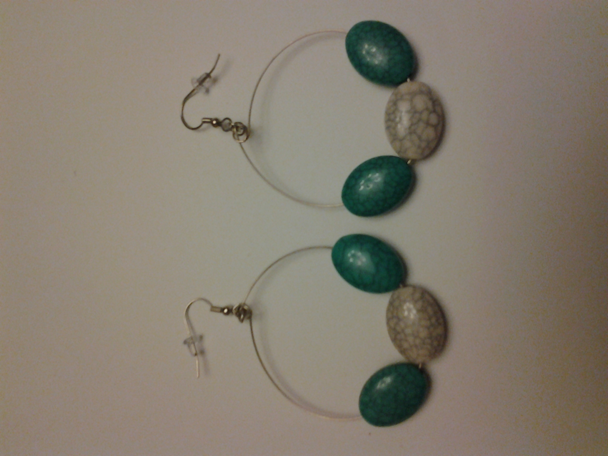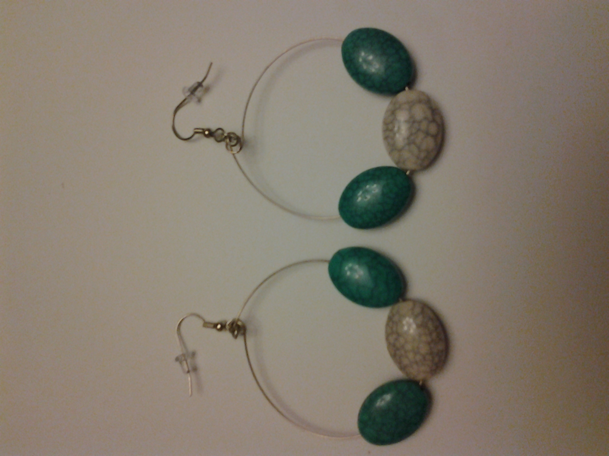 -Plastic beads -Sliver wire and hook -White, and turquoise -Handmade -Made as in picture