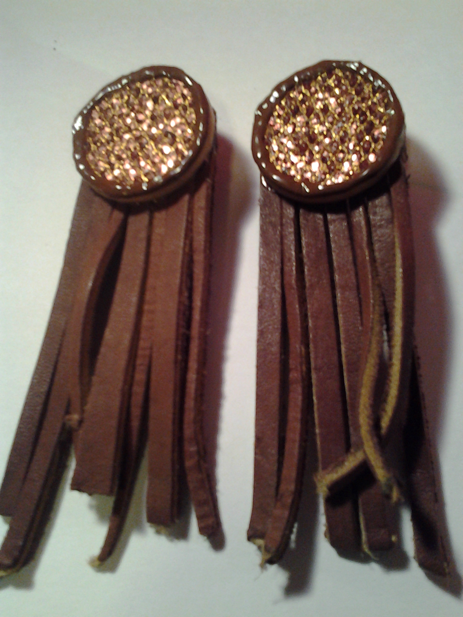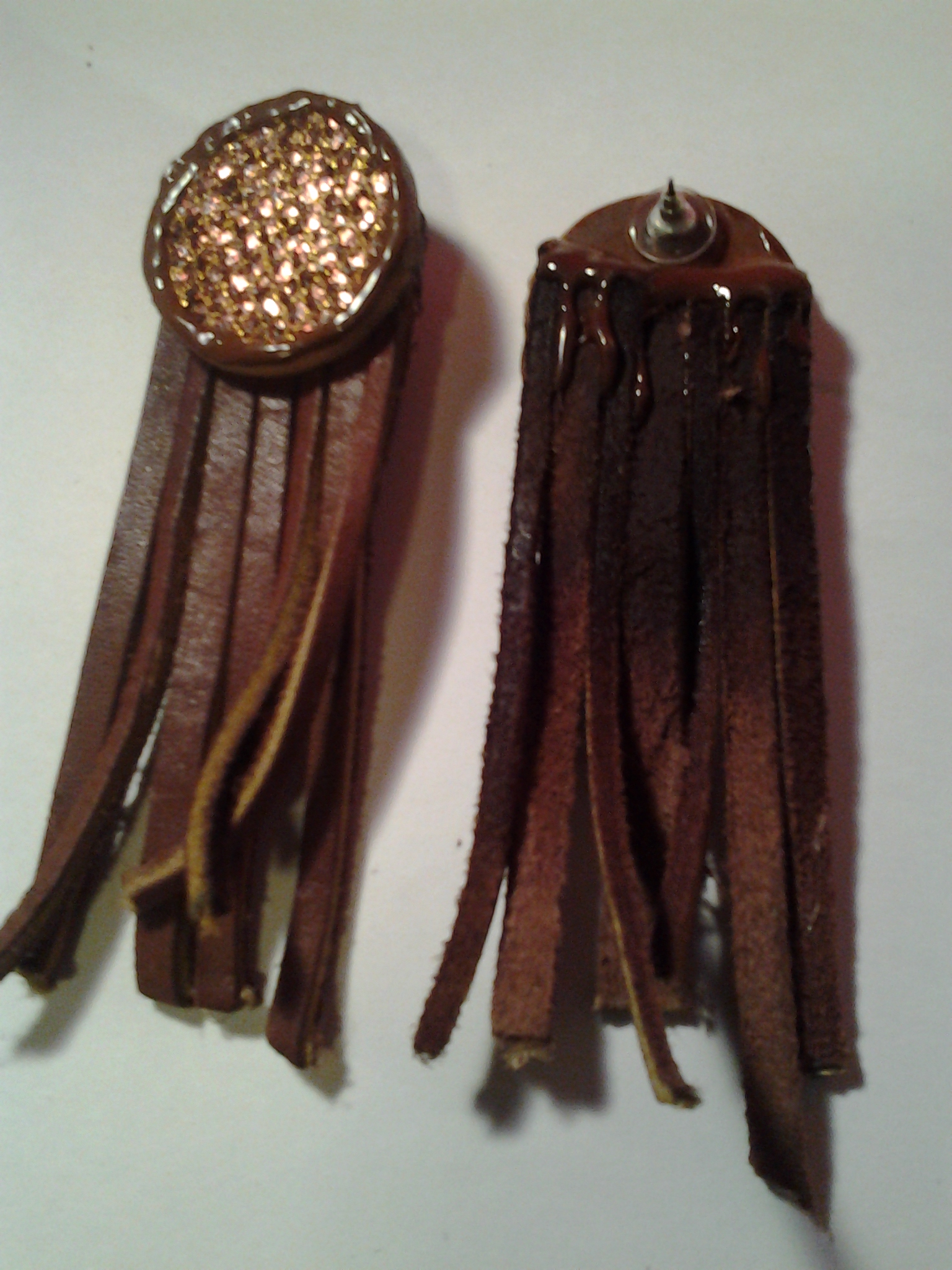 Printed designed stud earring with leather fringes wooden post. Made as in picture. Handmade one of a kind original design.