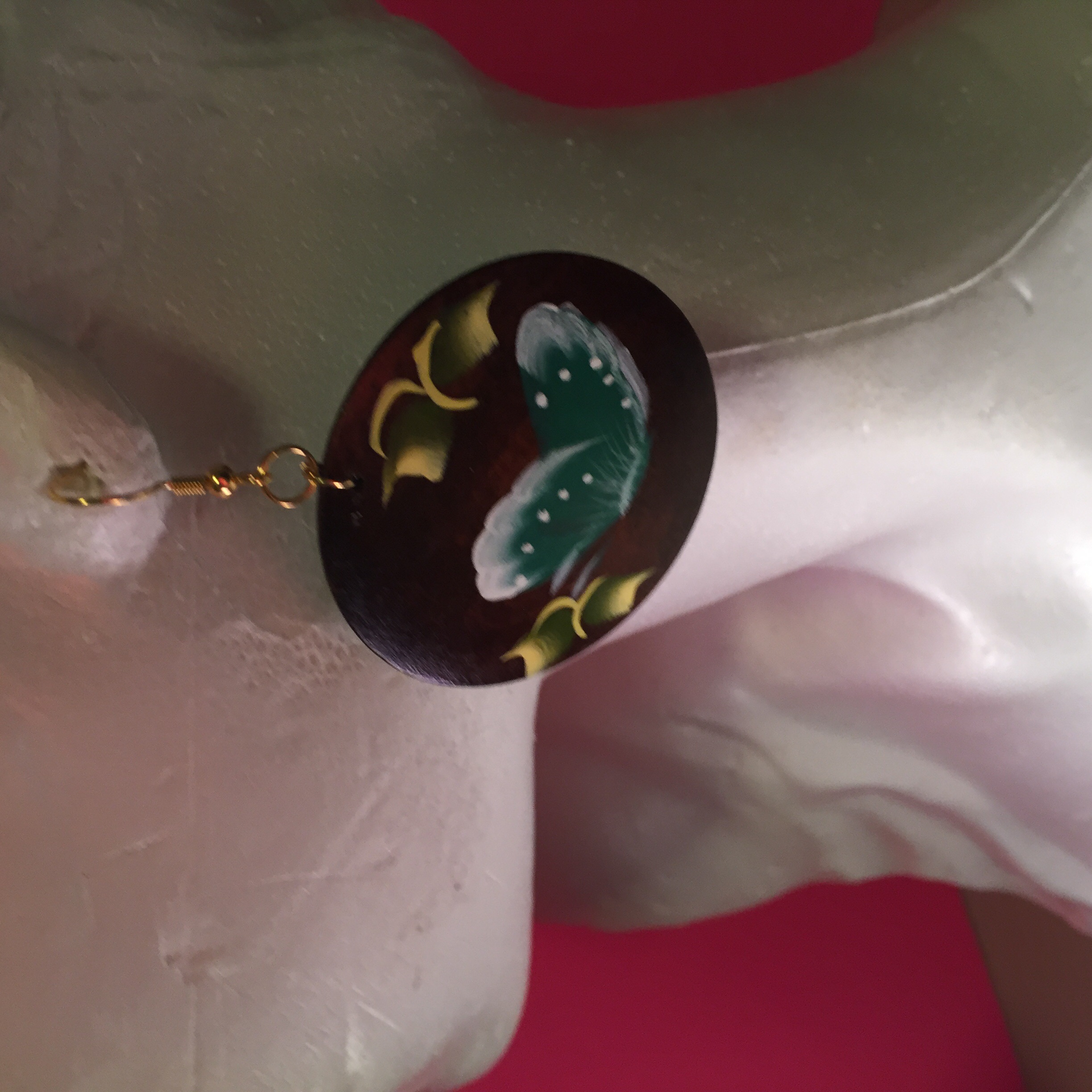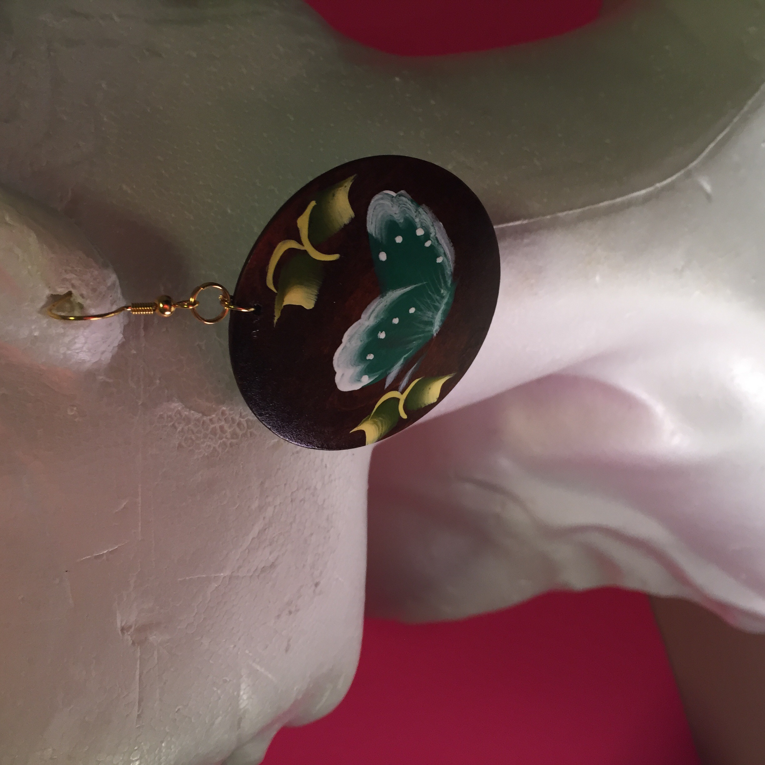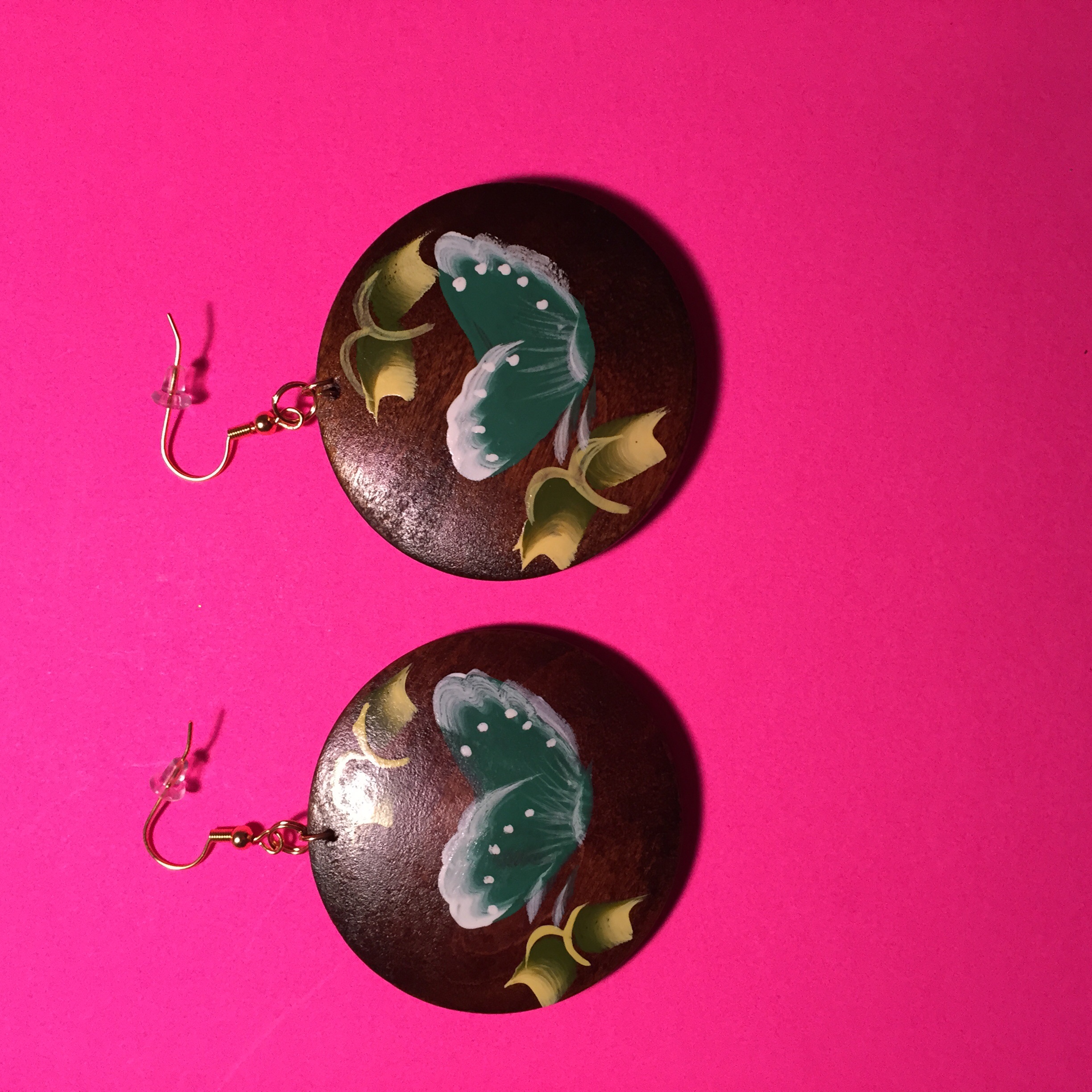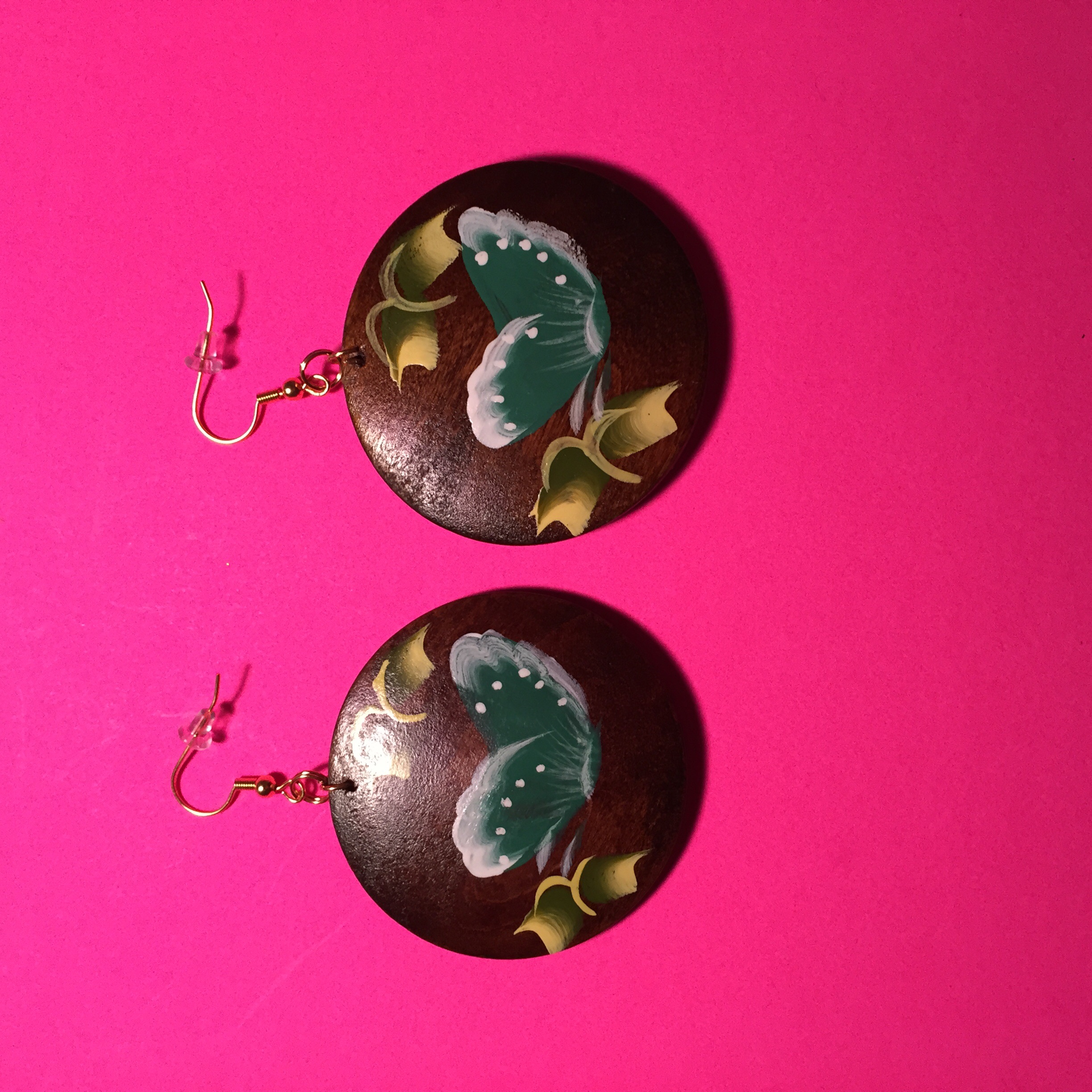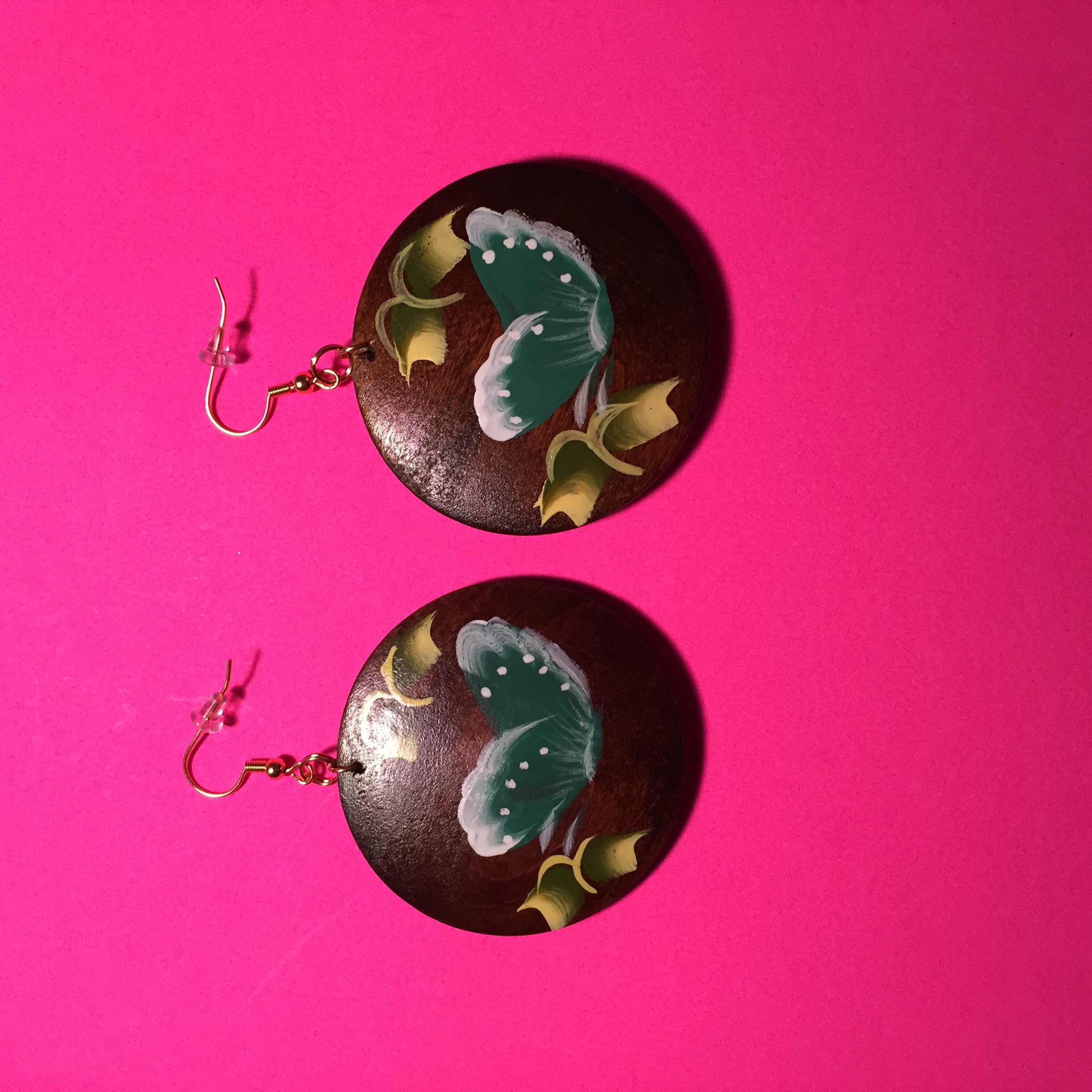 -Wooden Earrings -Painted Design -Circle Shaped -Metal Hook -Fashionable statement earrings. -One of a kind piece. -Custom and handmade. -Made as in picture.