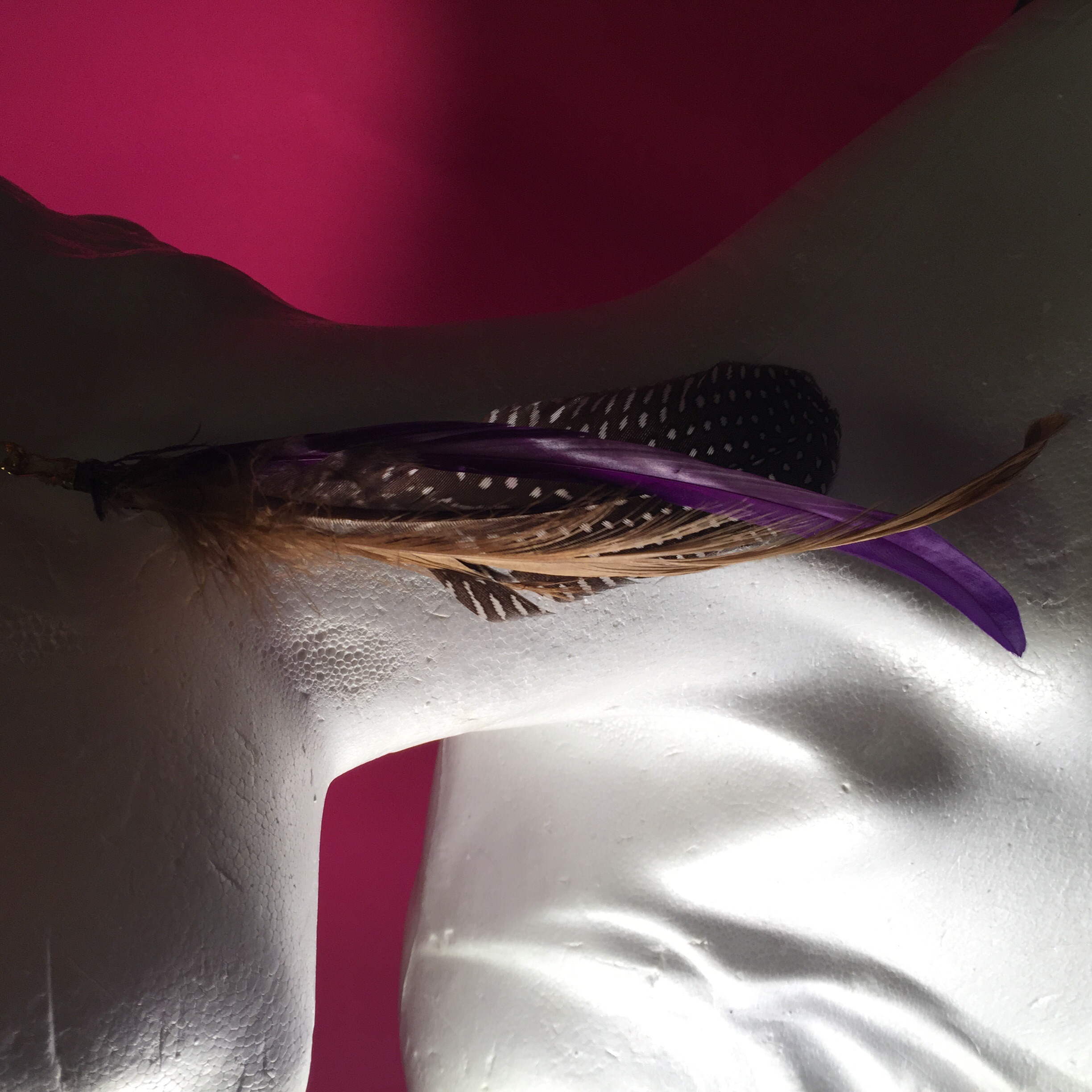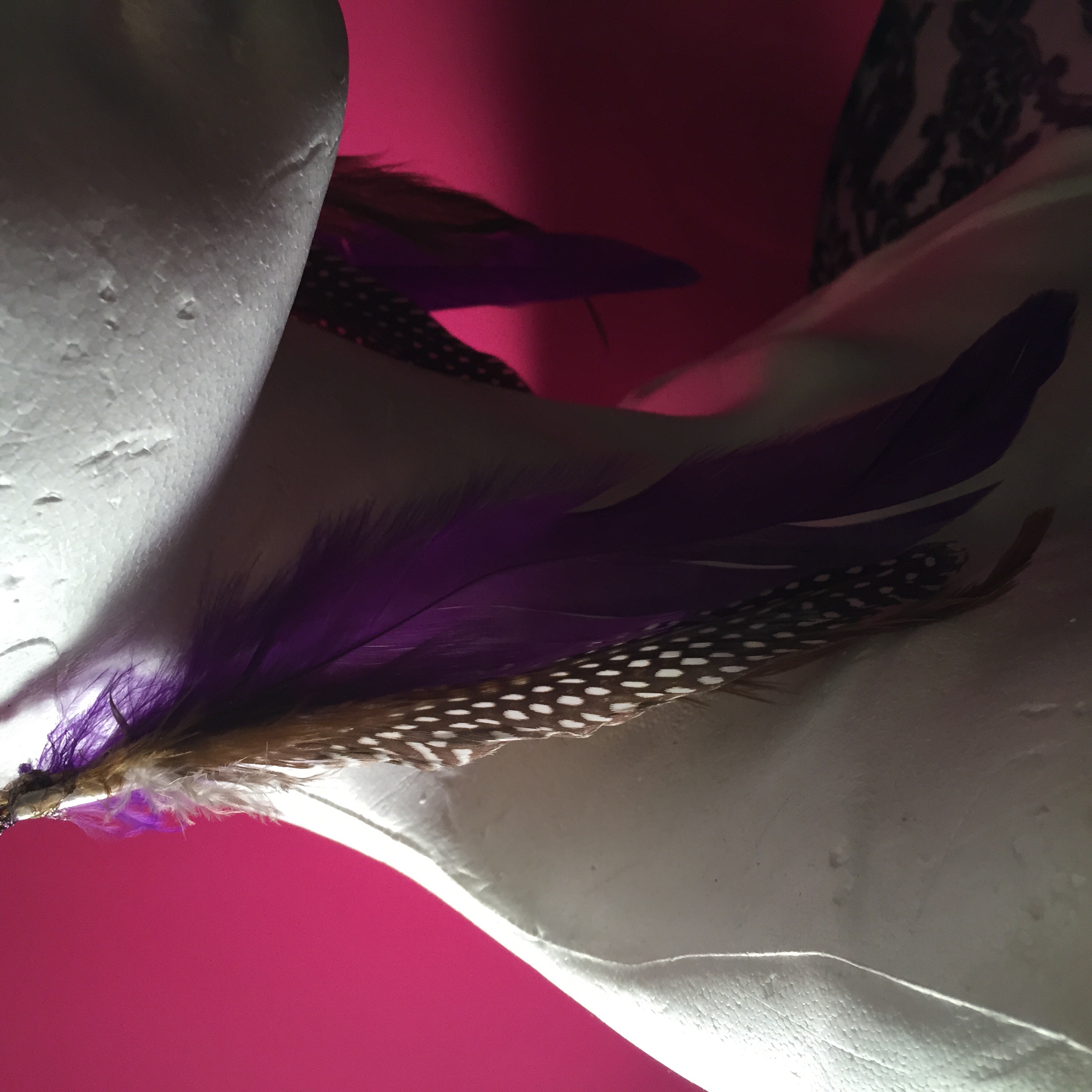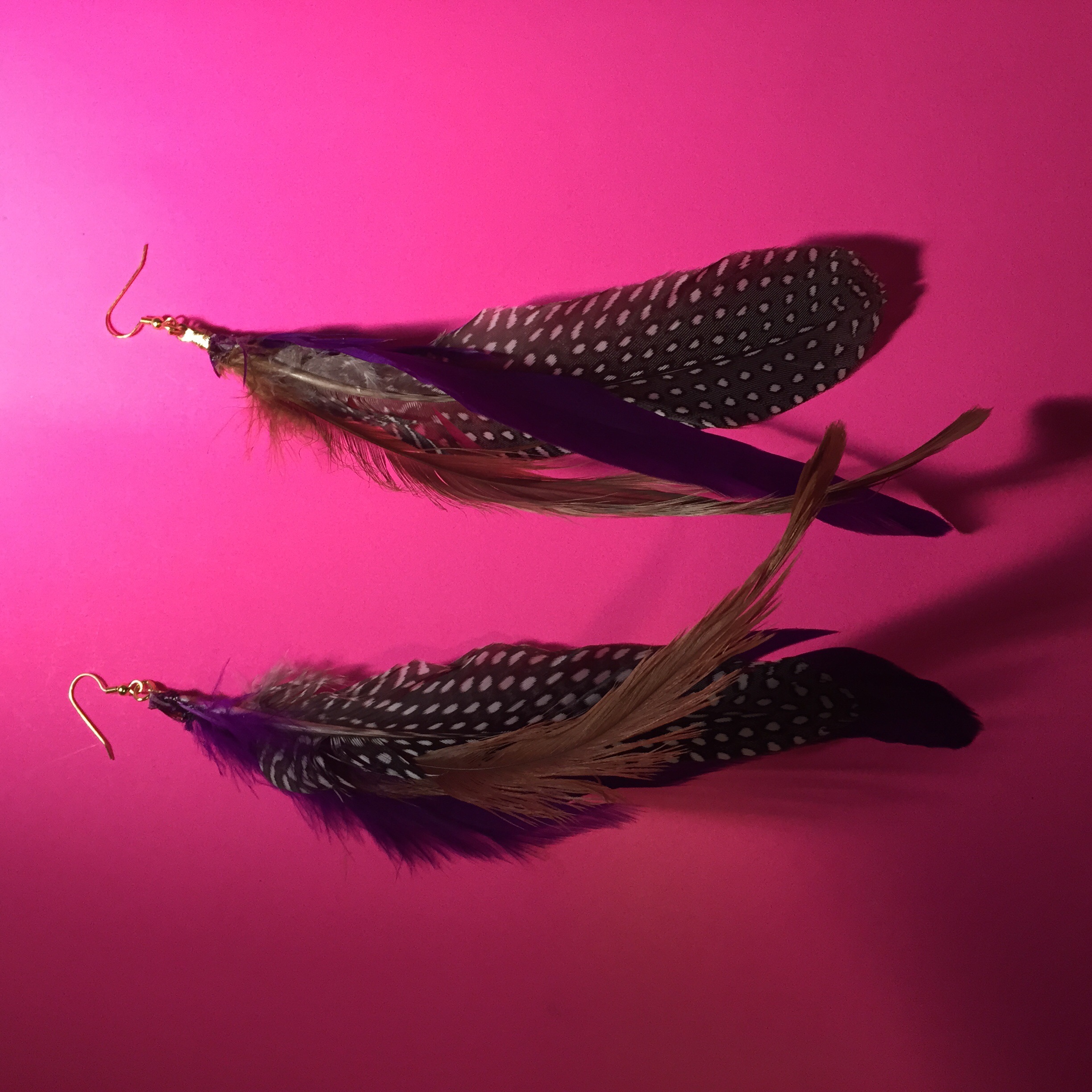 - Color: black and white doted, purple, and brown. - Gold hook. - Size: large. - Dangling. - Made as in picture. -One of a kind piece. -Custom and handmade.