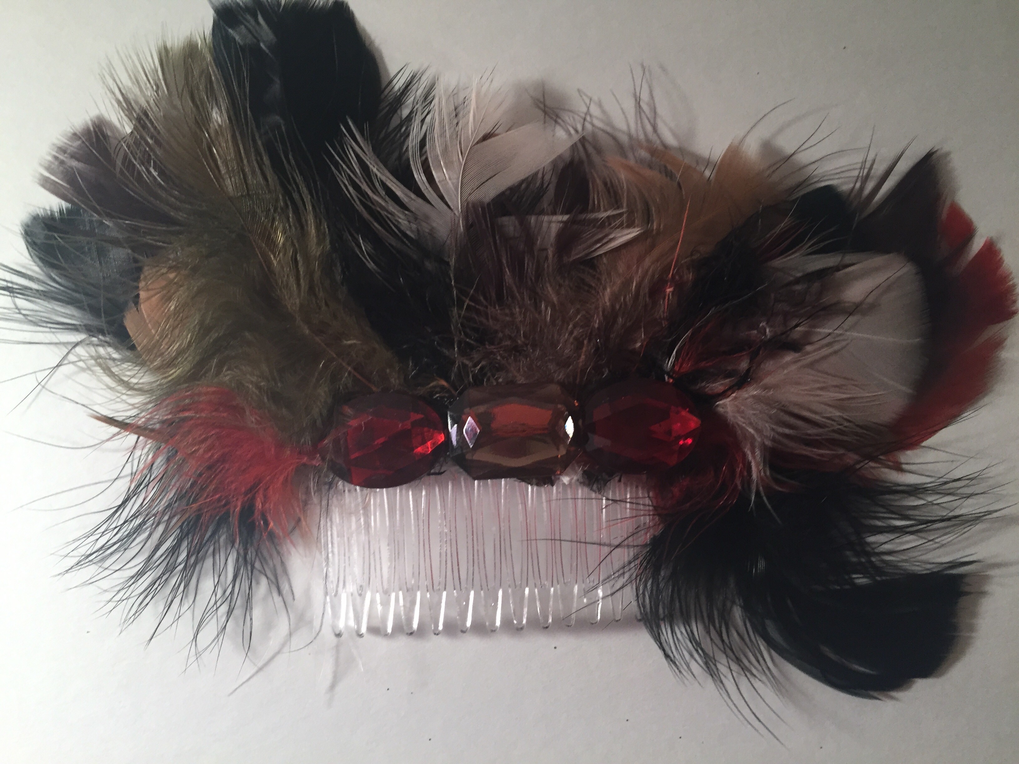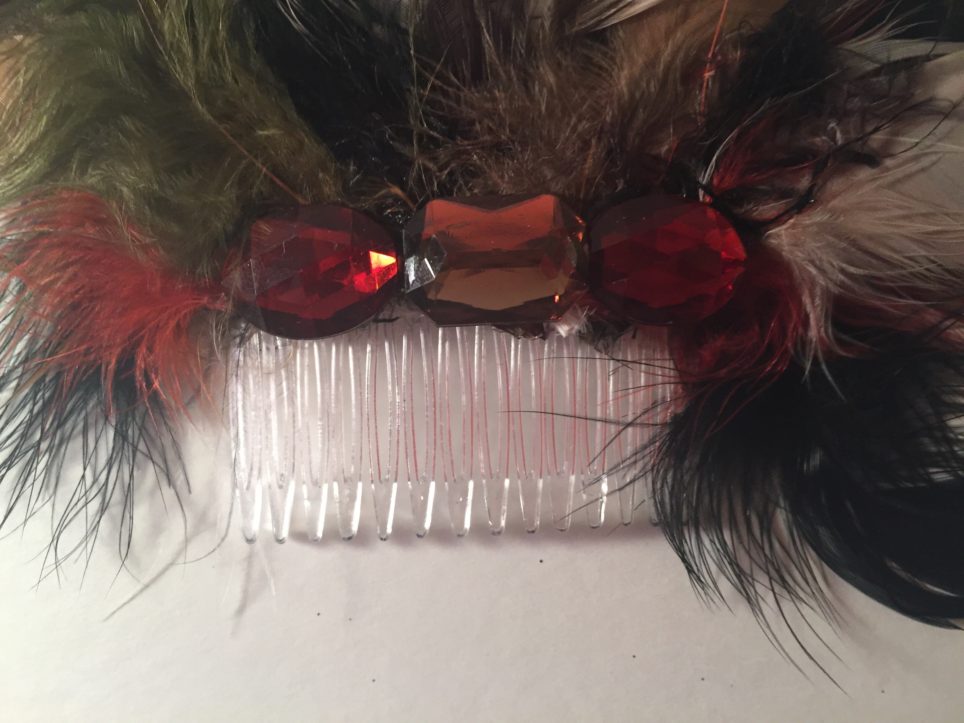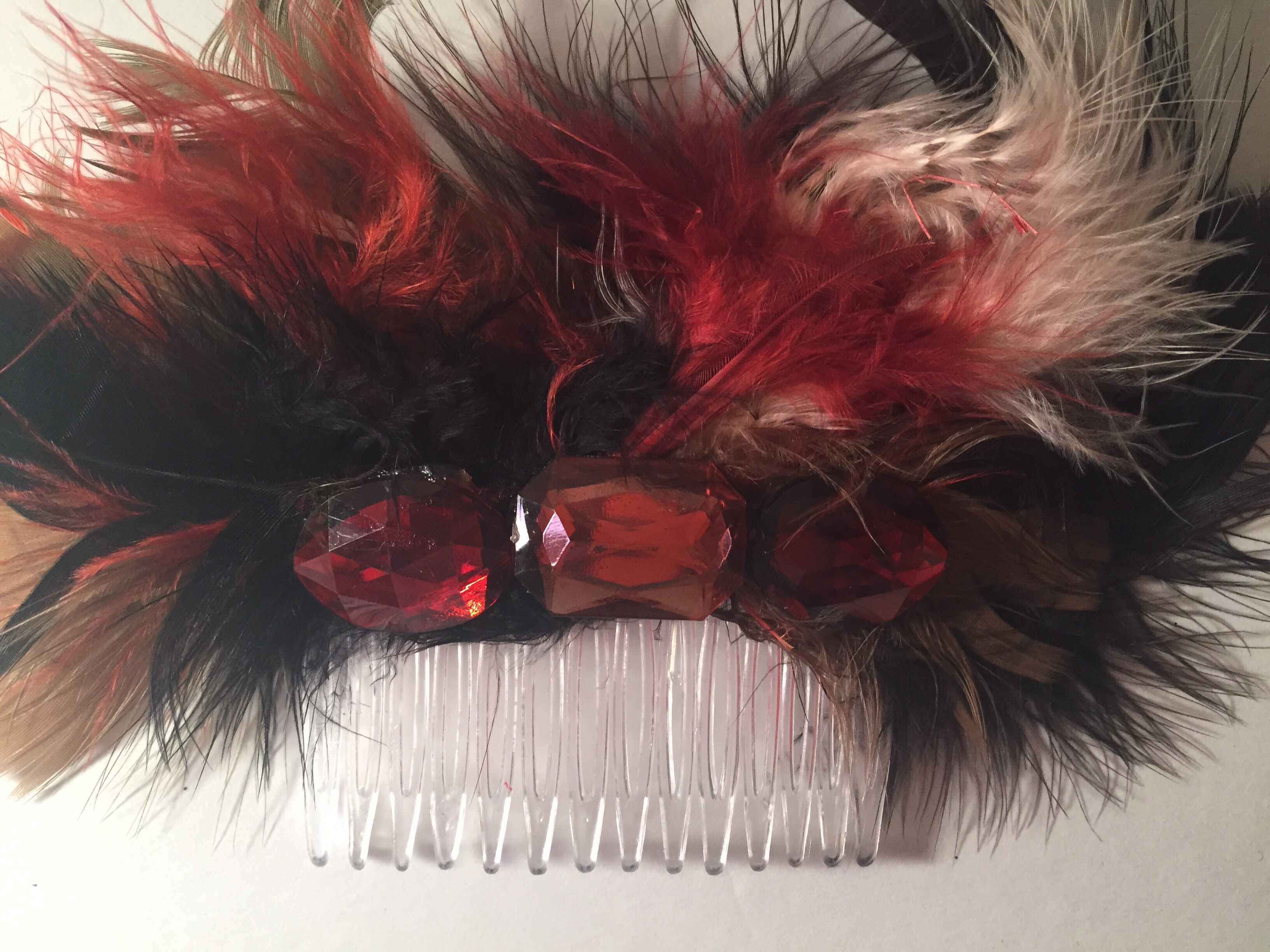 -Materials: Rhinestone crystal and feathers. -Size: 3.75" wide x 3.25" hight -Plastic comb -Color: brown, black, and red -Custom and handmade. -Made as in picture.