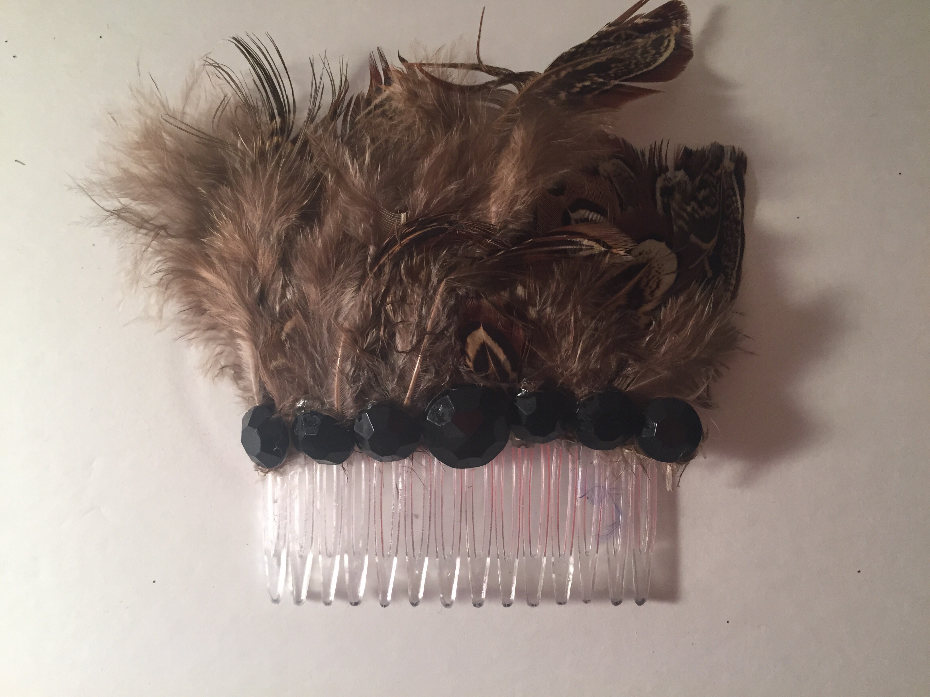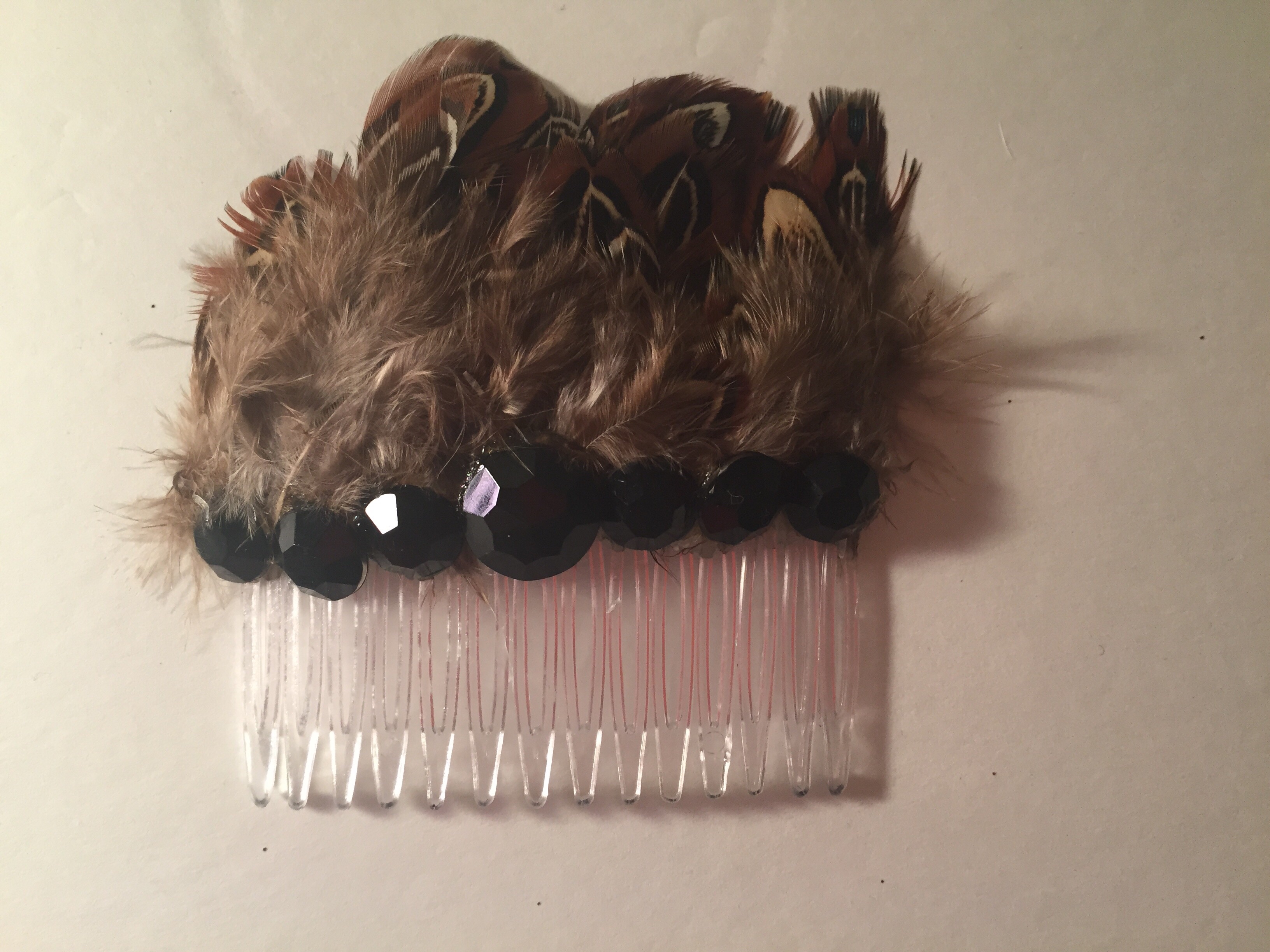 -Materials: Rhinestone crystal and feathers. -Size: 3.75" wide x 3.25" hight -Plastic comb -Color: brown and black -Custom and handmade. -Made as in picture.