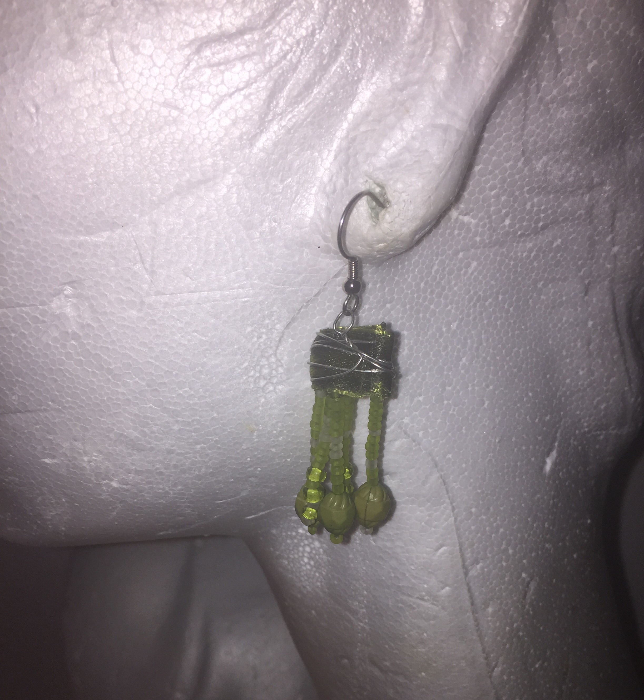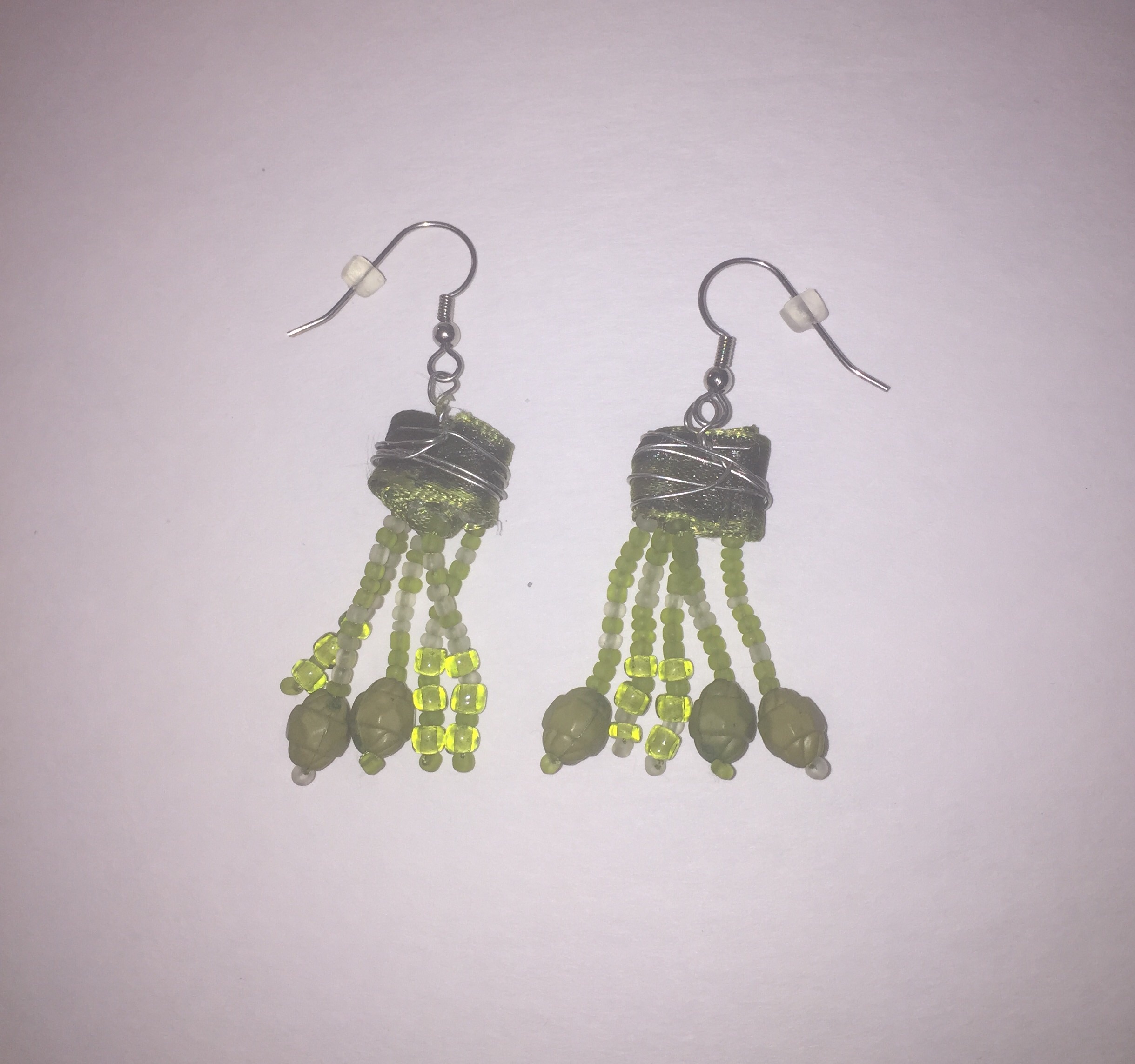 -Style: Drop -Color: Green -Silver metal hook -2 inches long -Number of beads in each earring may vary -Custom Design -Hand made -One of a kind -Made as in picture