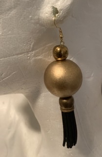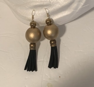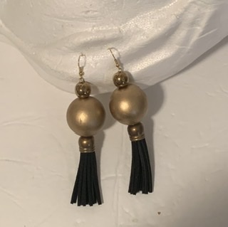 -Drop fabric leather tassel -Wooden beads -Color: black and gold -5” long -Handmade -One of a kind -Made as in picture