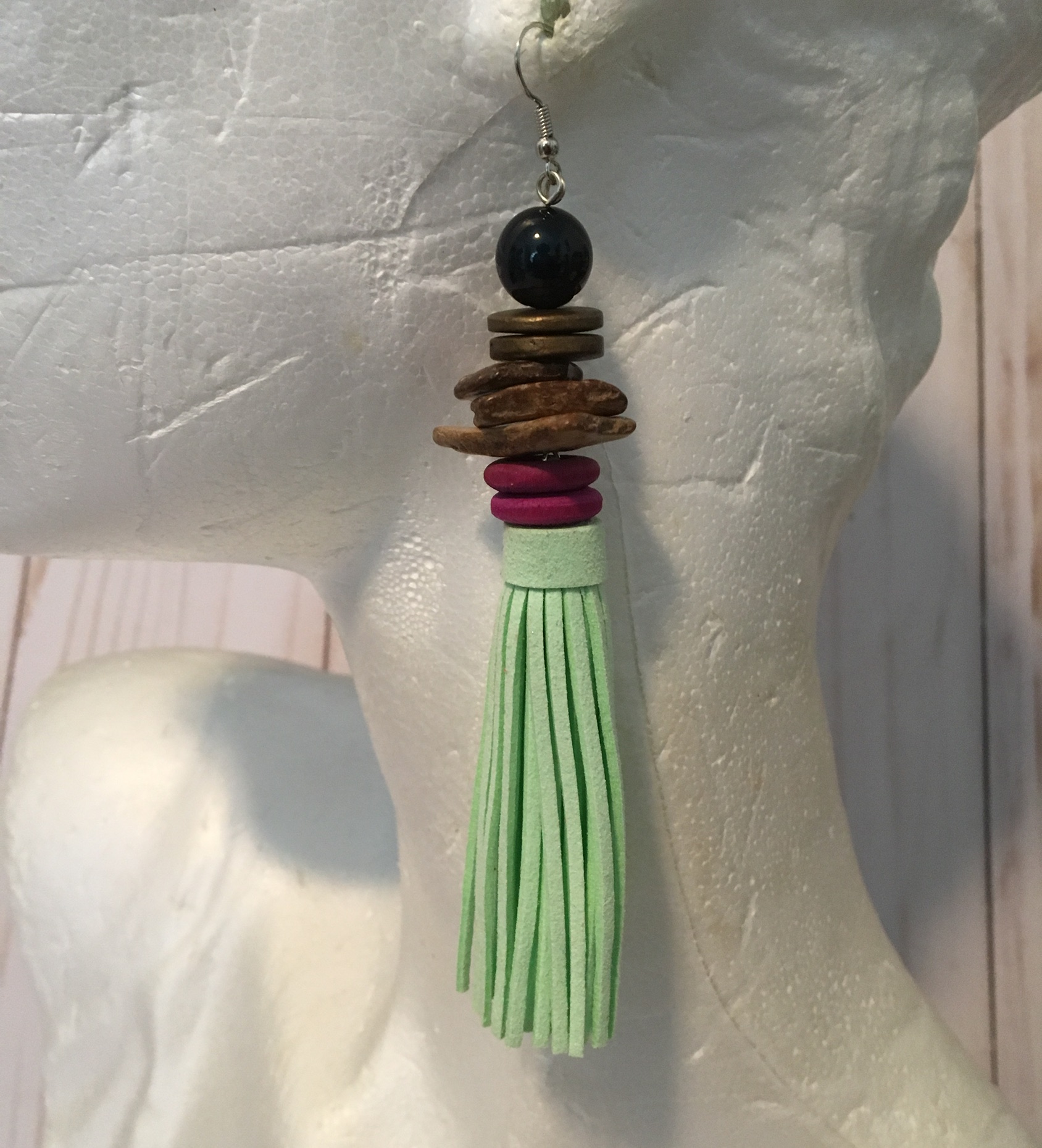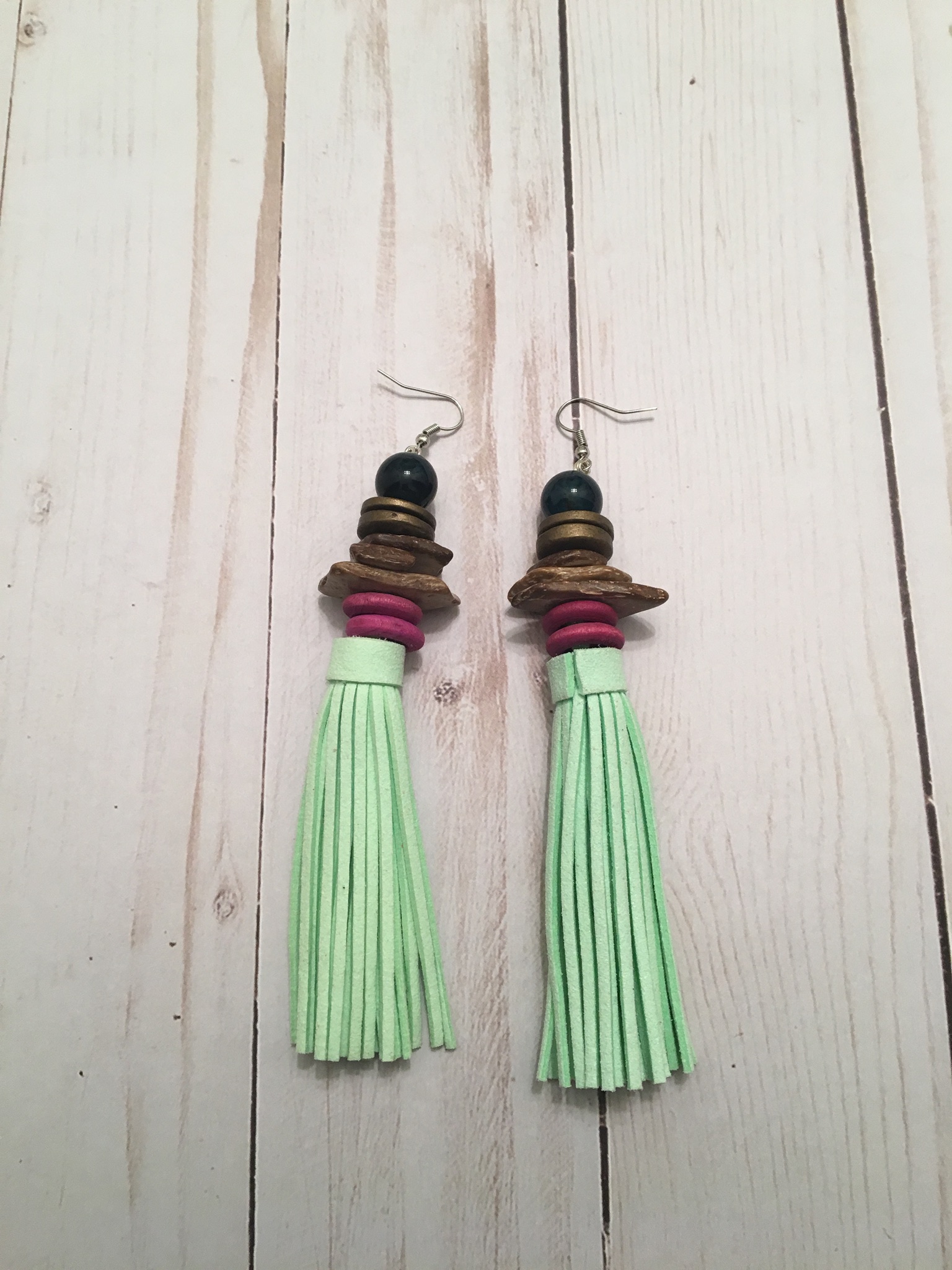 -Drop fabric tassel -Glass,acrylic, and jeweled beads -Color: light green -4" long -Handmade -One of a kind -Made as in picture
