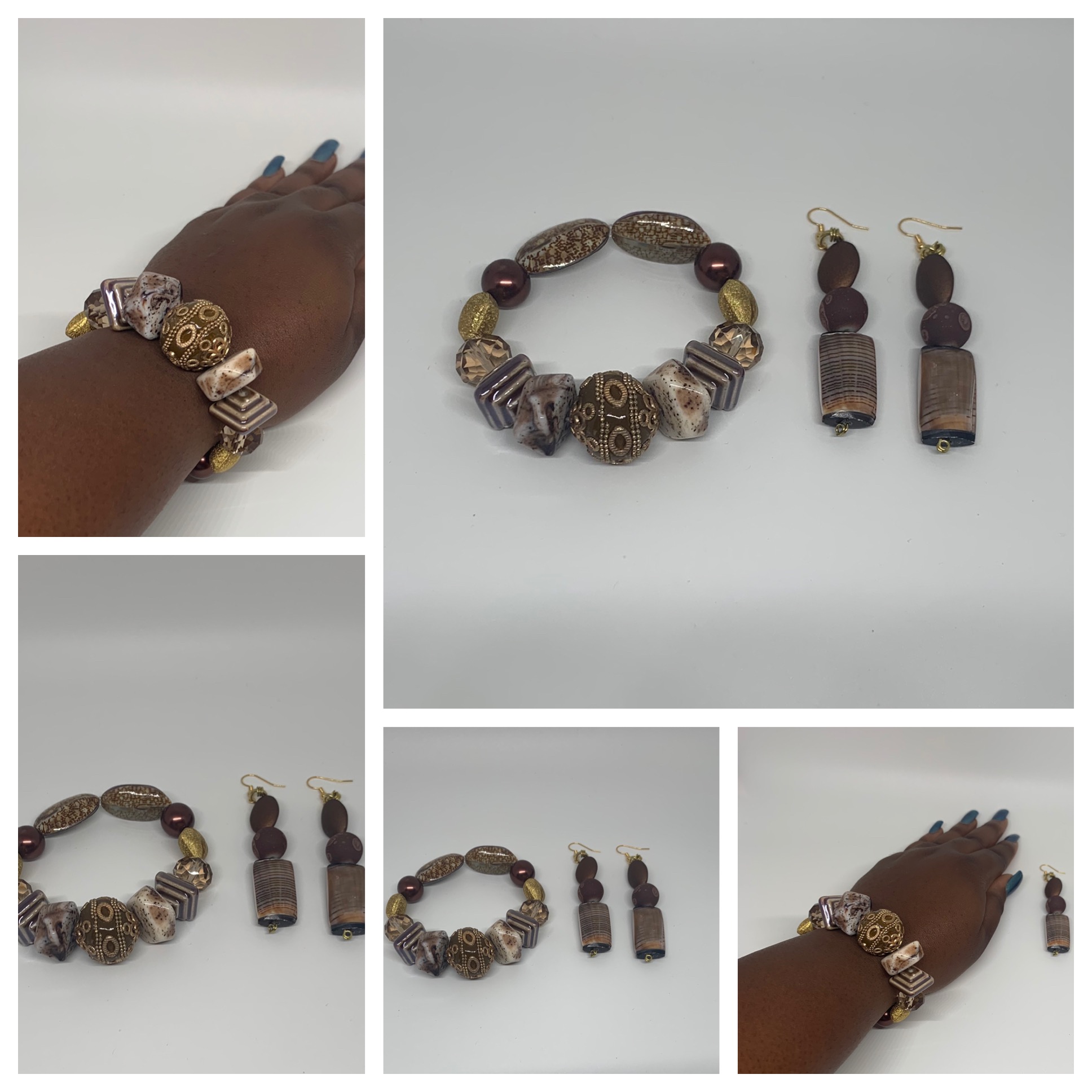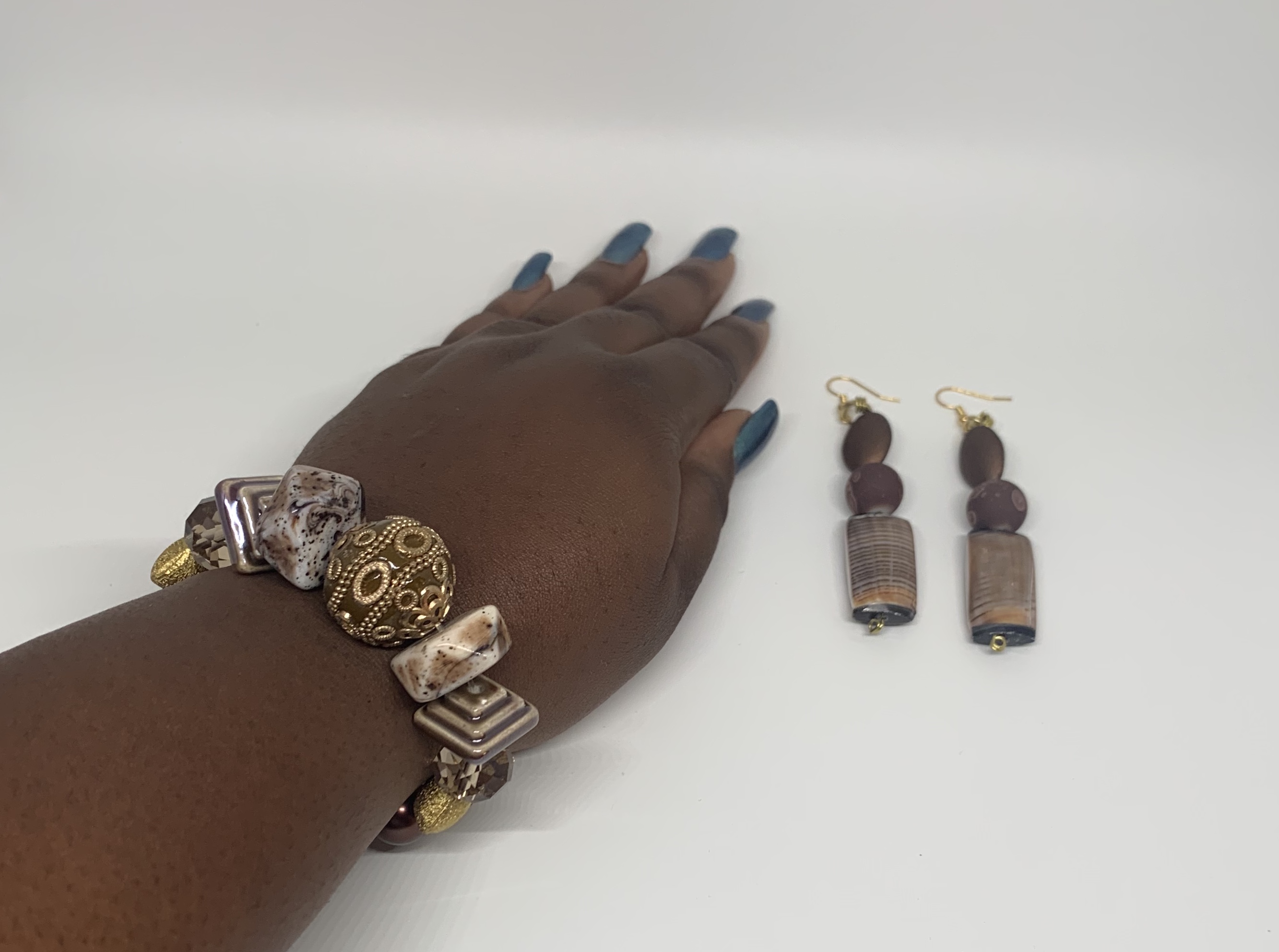 - 7 1/2 inches beaded bracelet - 3” long bead drop earrings - stretch Bracelet - Embellished beads - color: brown - handmade - made as in picture
