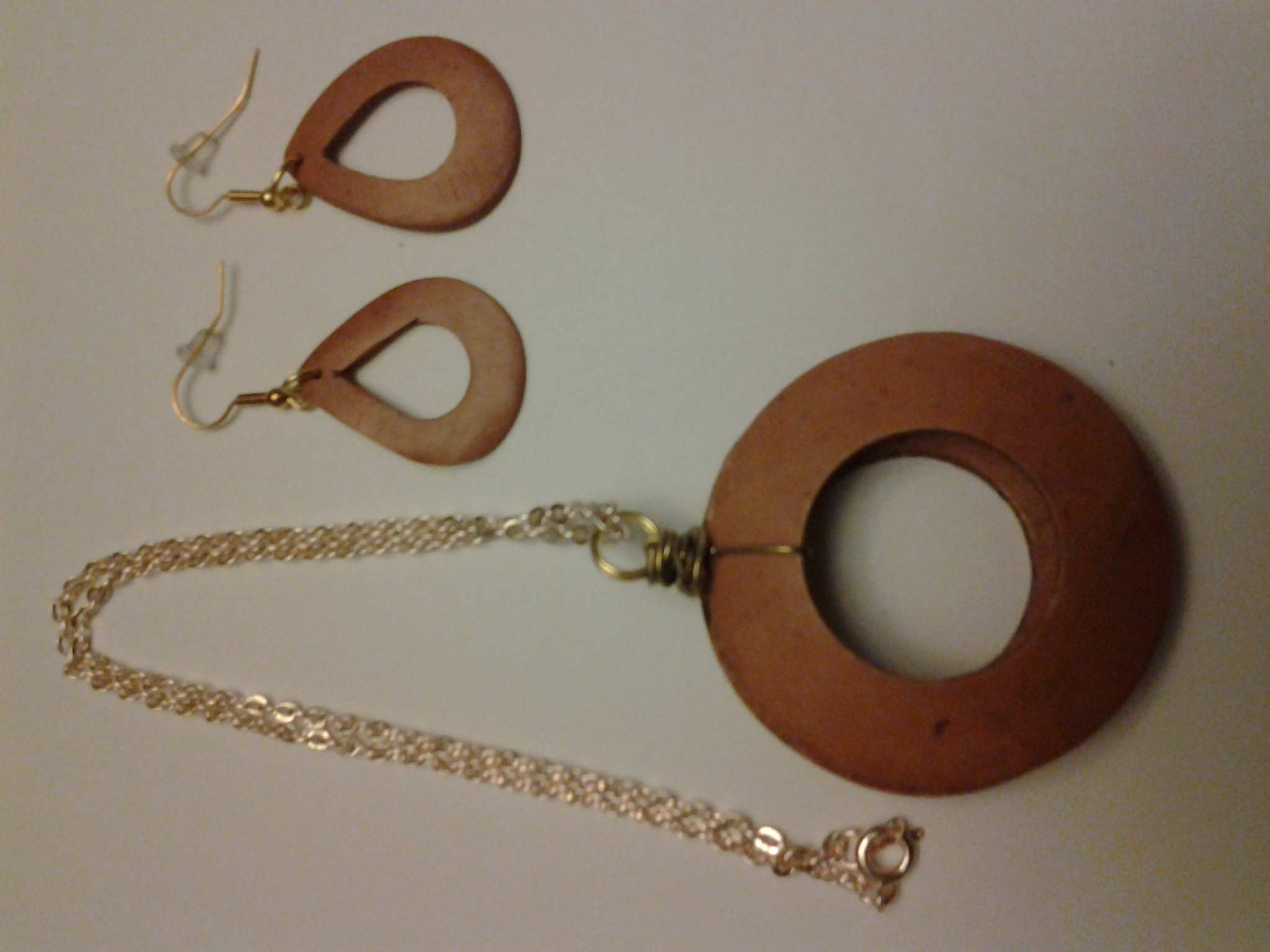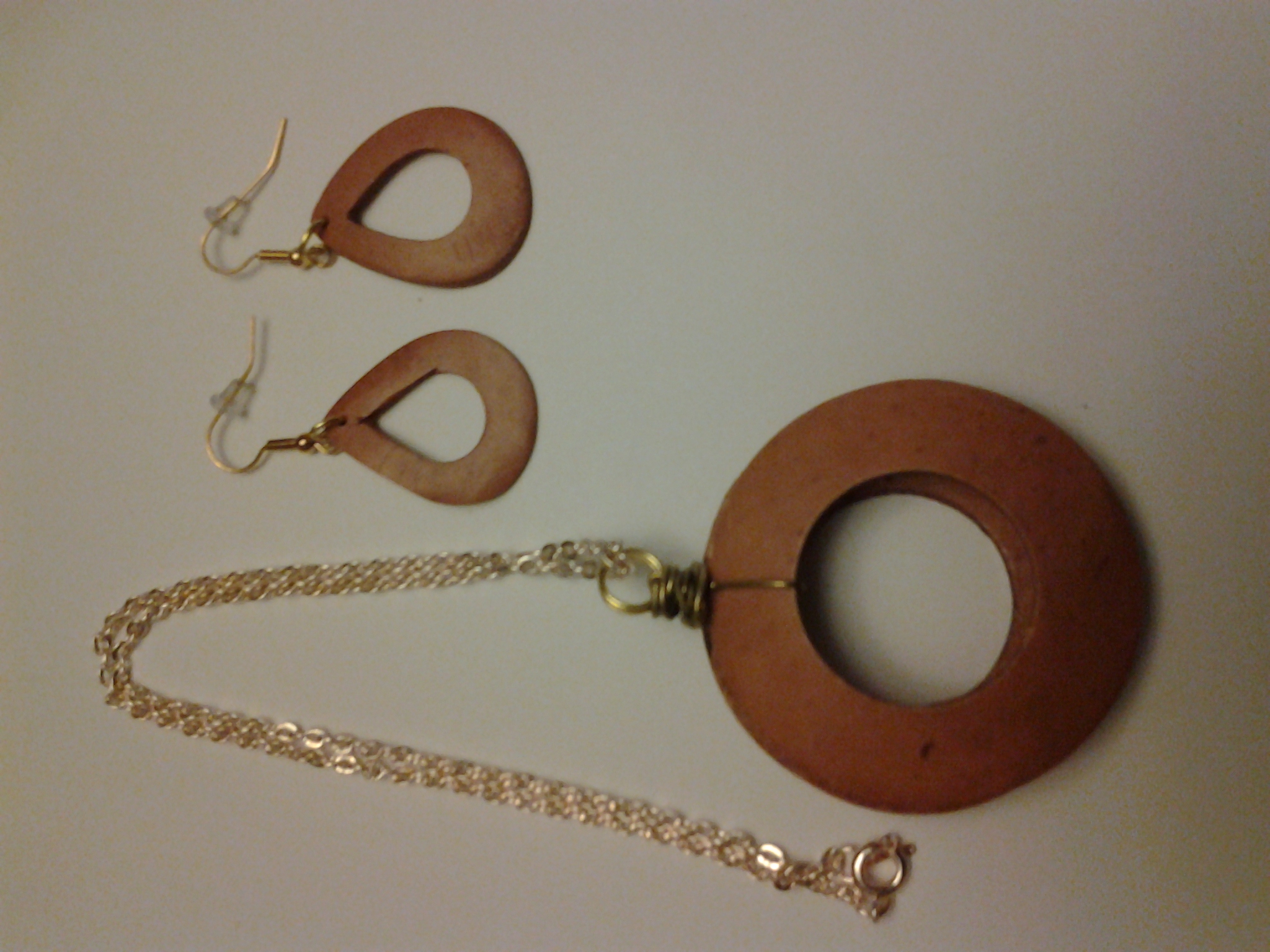 Gold chain necklace with wooden round shaped pendent. Matching wooden round shaped earrings. Handmade.